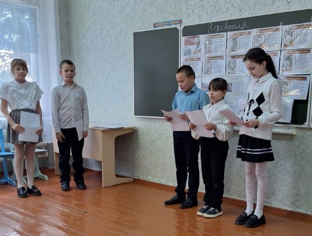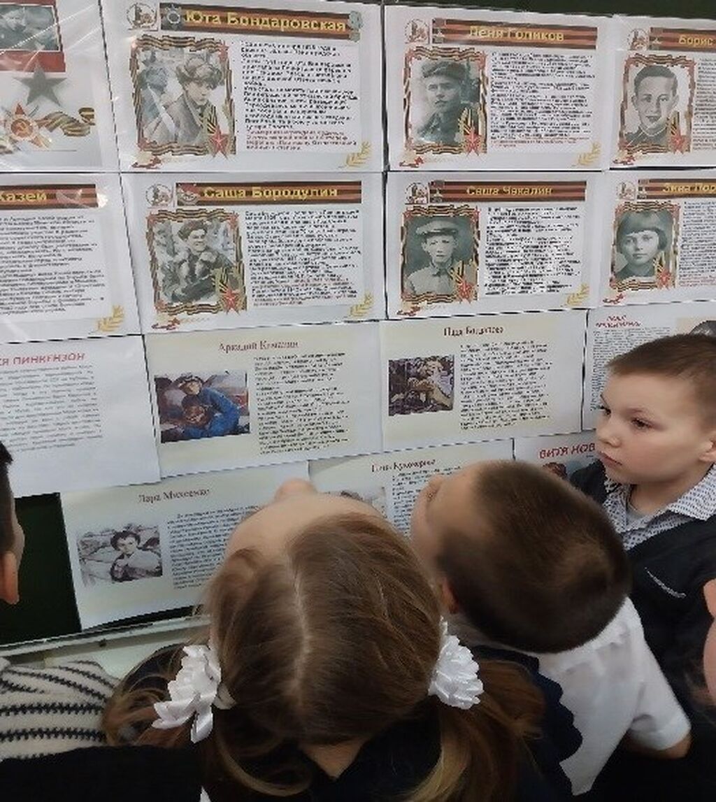 Ученики 4 класса рассказали о совершенных подвигах юных пионеров: Володи Дубинина, Володи Колядова, Вали Котик, Зины Портновой, Лени Голикова, Марата Казея, Вити Коробкова, которые отдали свои жизни, защищая Родину от врагов, и были удостоены самой высокой награды — Героя Советского Союза.